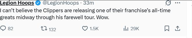 美媒Legion Hoops发推写道:“我简直不敢相信快船队竟然在一位球队传奇人物的告别巡演中途将他裁掉。”