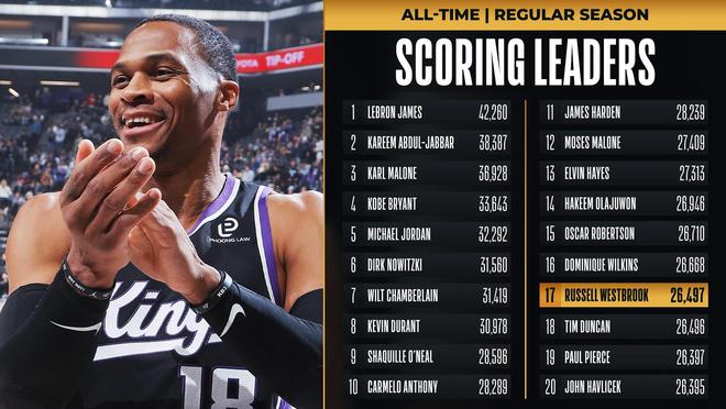 传奇之路,威少总得分超越邓肯升至历史第17